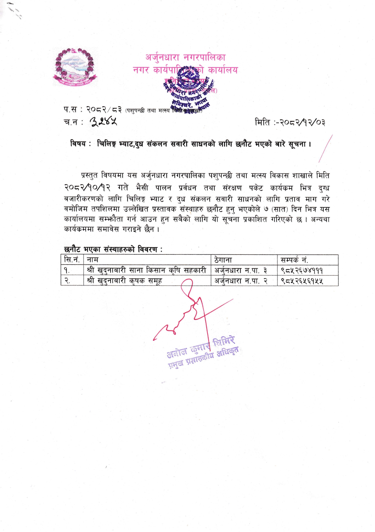 » चिलिङ्ग भ्याट, दुध संकलन सवारी साधनको लागि छनौट भएको बारे सूचना।