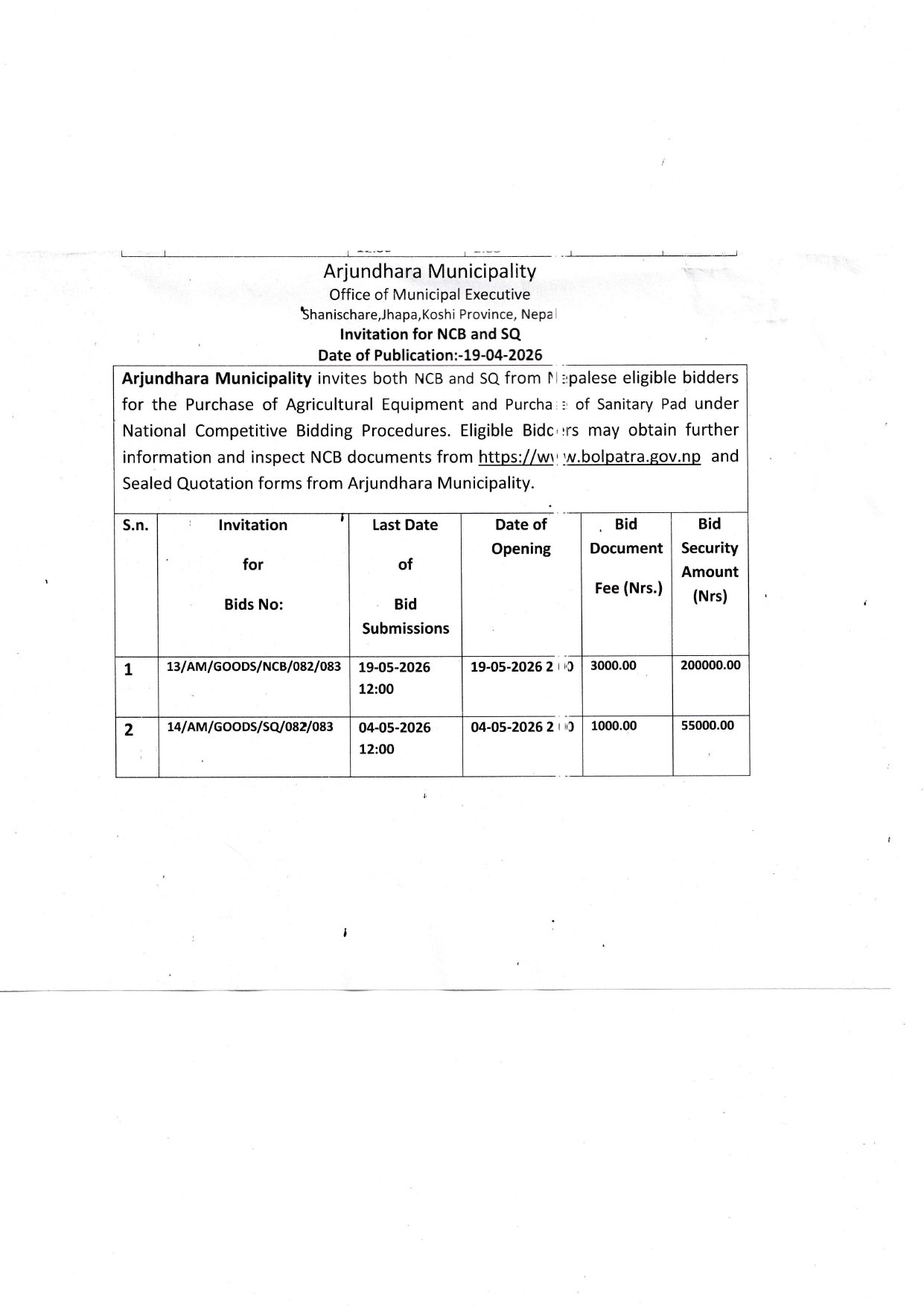 सार्वजनिक खरिद/बोलपत्र सूचना