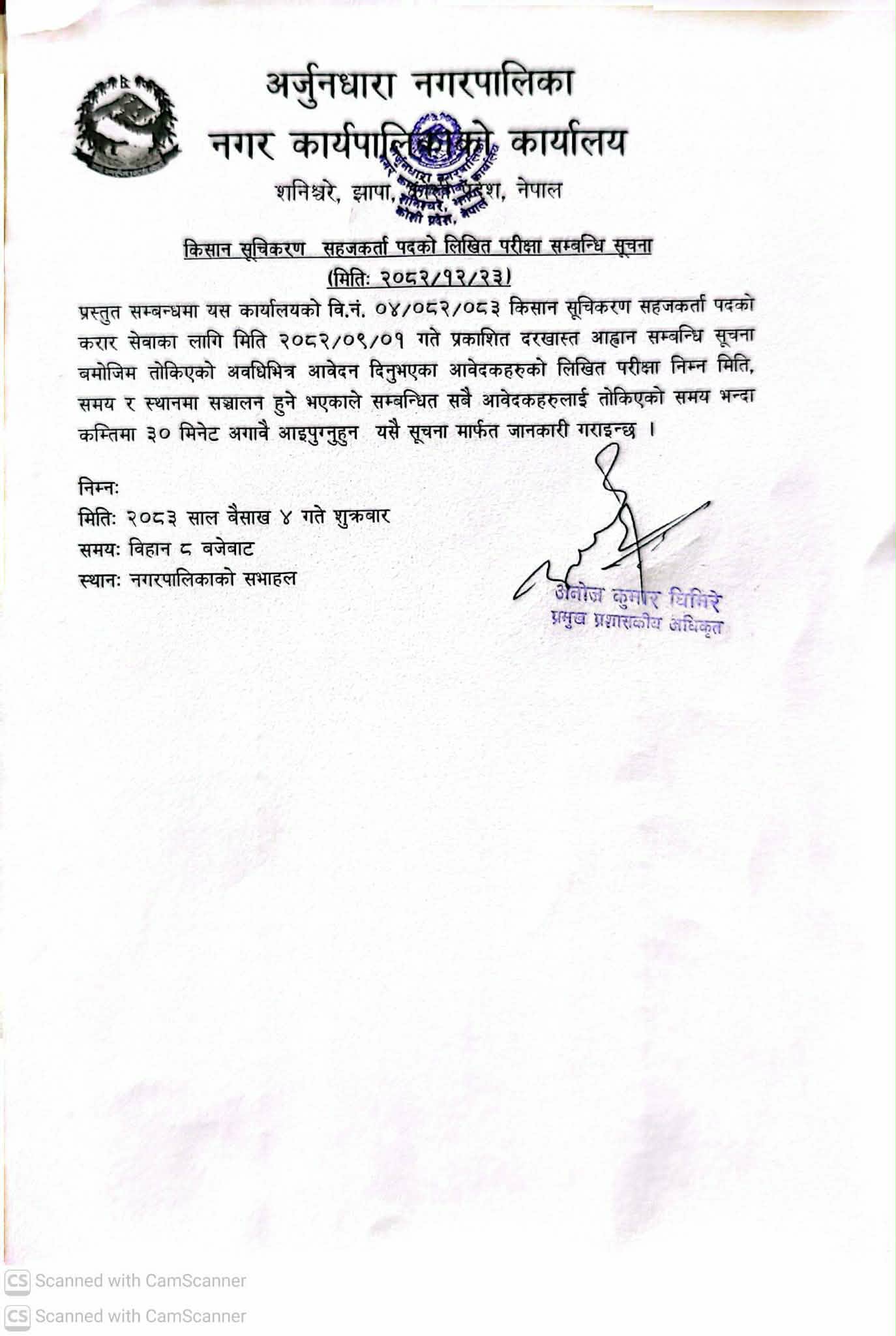 किसान सूचिकरण सहजकर्ता पदको लिखित परीक्षा सम्बन्धि सूचना